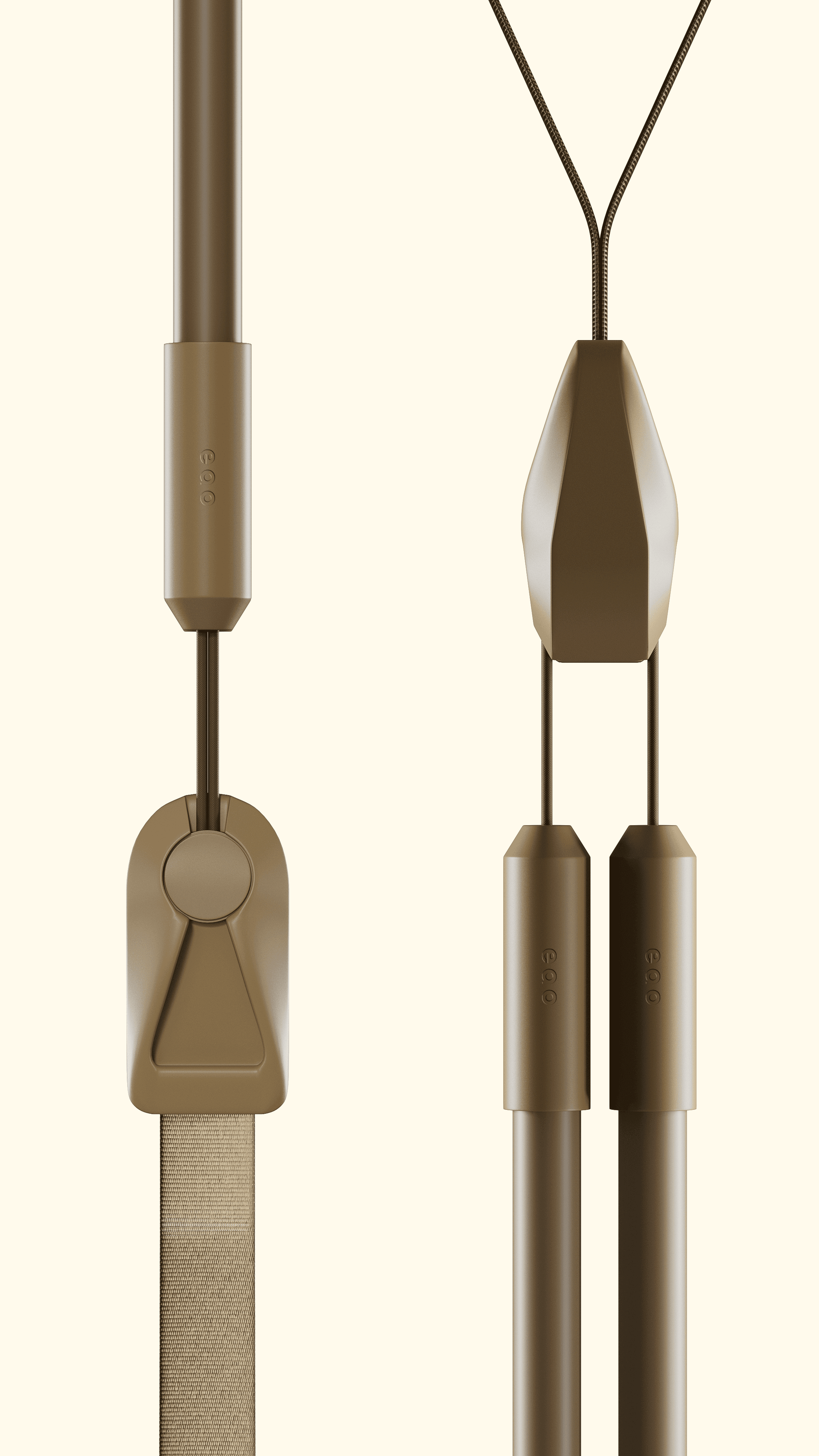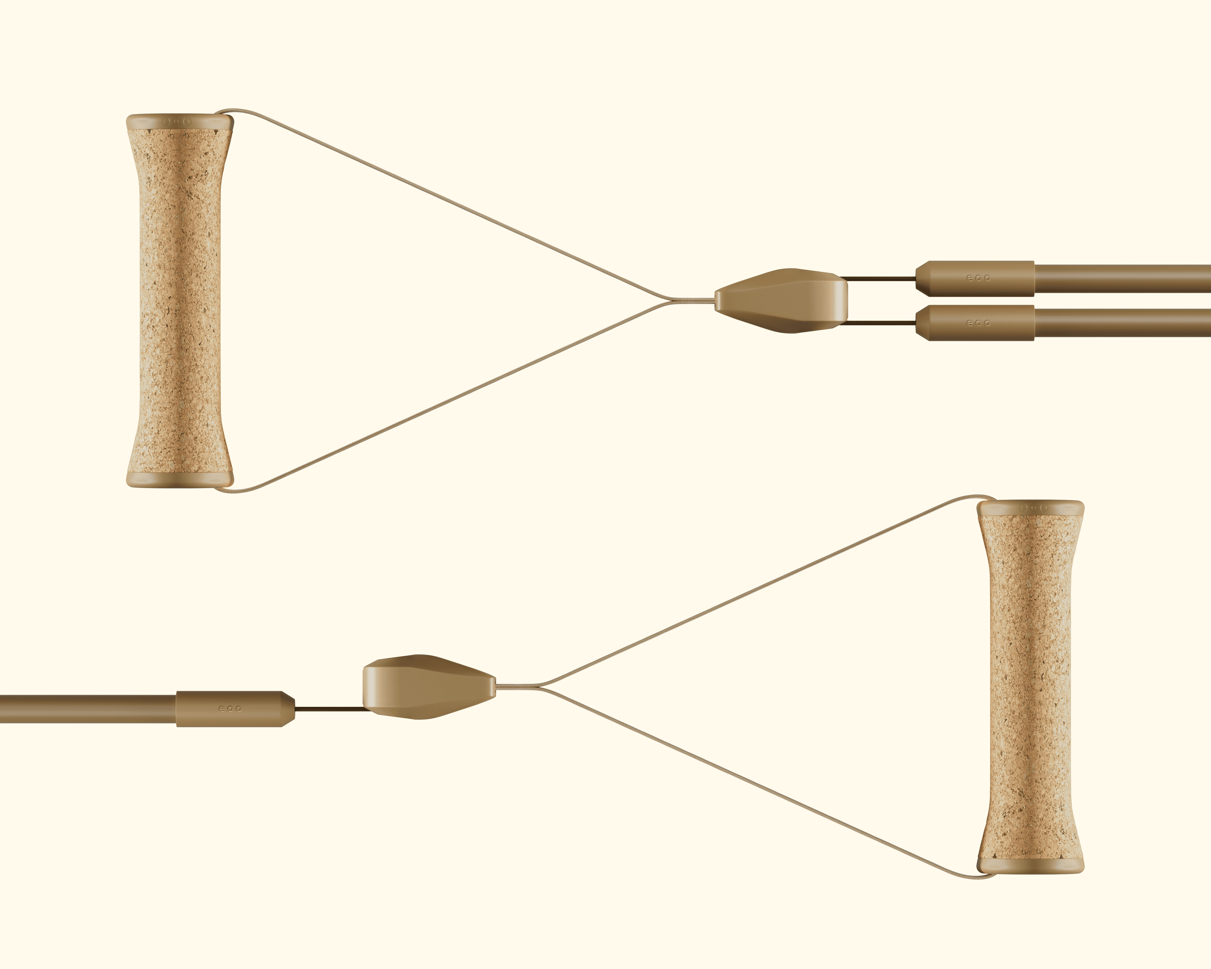 Cork, Eco-Nylon, recycled plastic, custom brass. Premium, eco-friendly, visually seamless.